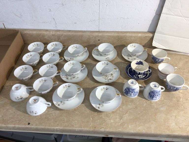 16 PINECREST FINE CHINA CUPS, 7 SAUCERS, 4 COUNTRY SIDE CUPS, 1 SPADE CHINA CUP, 1 WILLOW CUP & SAUCER