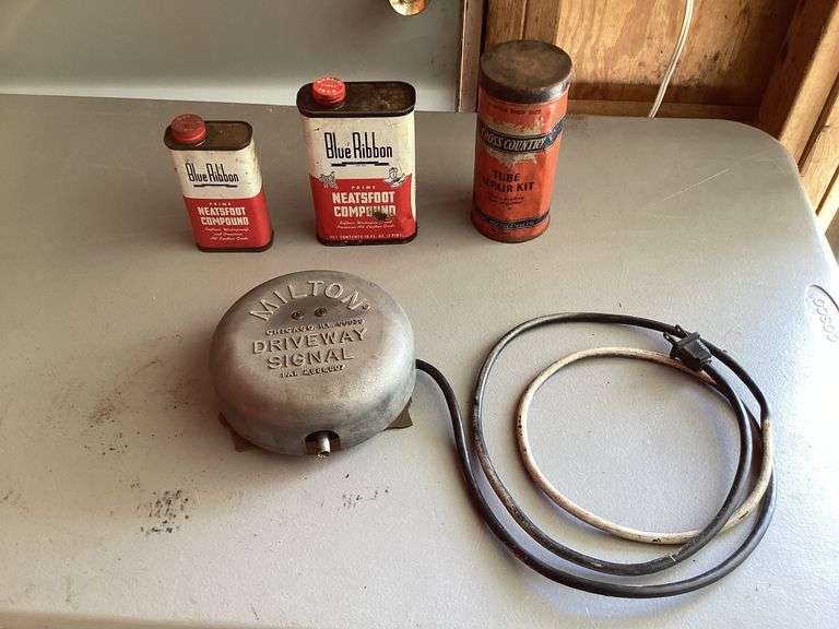 3 VINTAGE TINS AND VINTAGE DRIVEWAY GAS STATION SIGNAL