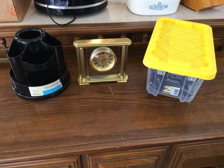 AT&T PHONES IN SMALL HEAVY DUTY TOTE, HOWARD MILLER DESK CLOCK, AND DESK ORGANIZER