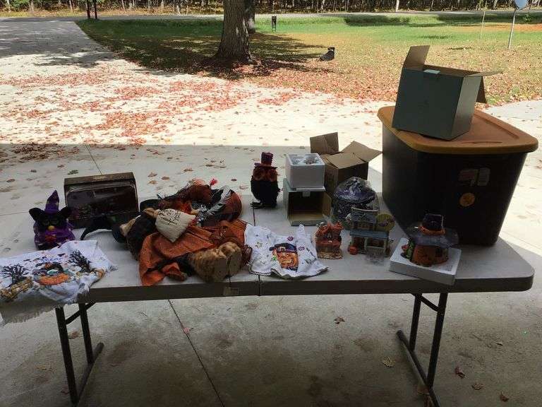 LEMAX GYPSY WAGON, PARTYLITE PIECES, WITCH KITTY, WITCH HAT, AND MORE IN TOTE W/LID