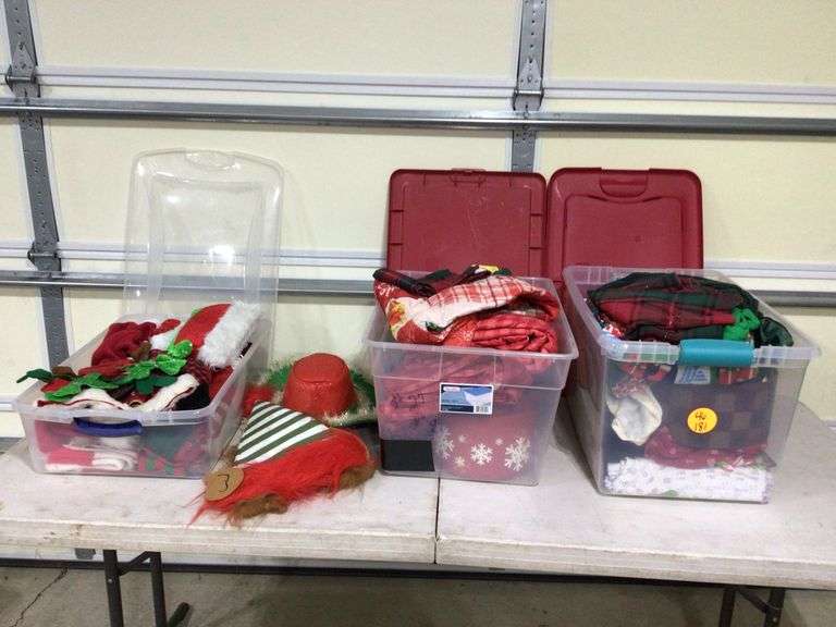 CHRISTMAS HATS, PAJAMAS, BLANKETS, TOWELS, AND MORE IN 3 TOTES W/LIDS