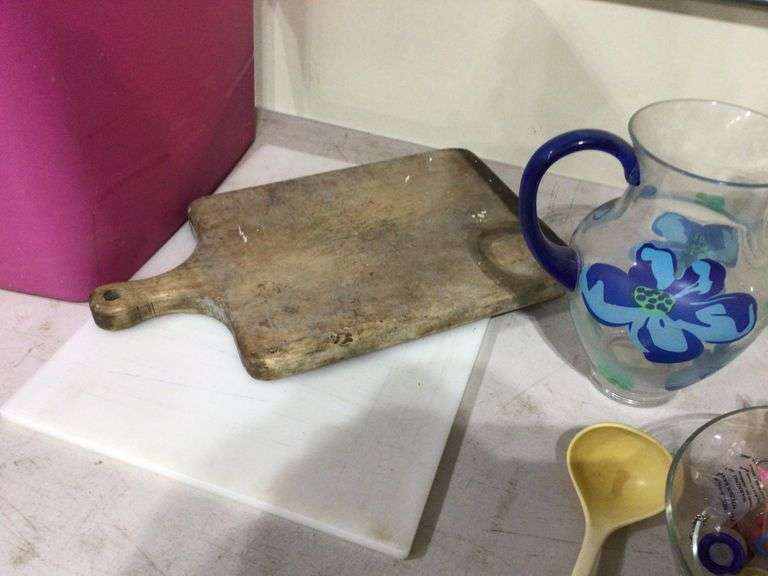 LARGE TERRARIUM/GLASS, CUTTING BOARDS, CERAMIC SOUP TUREEN, AND MORE IN TOTE W/LID