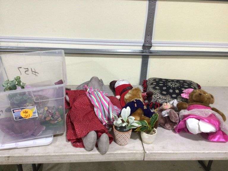 STUFFED RABBIT, PADDINGTON, THROW PILLOW, AND ARTIFICIAL PLANTS IN TOTE W/LID