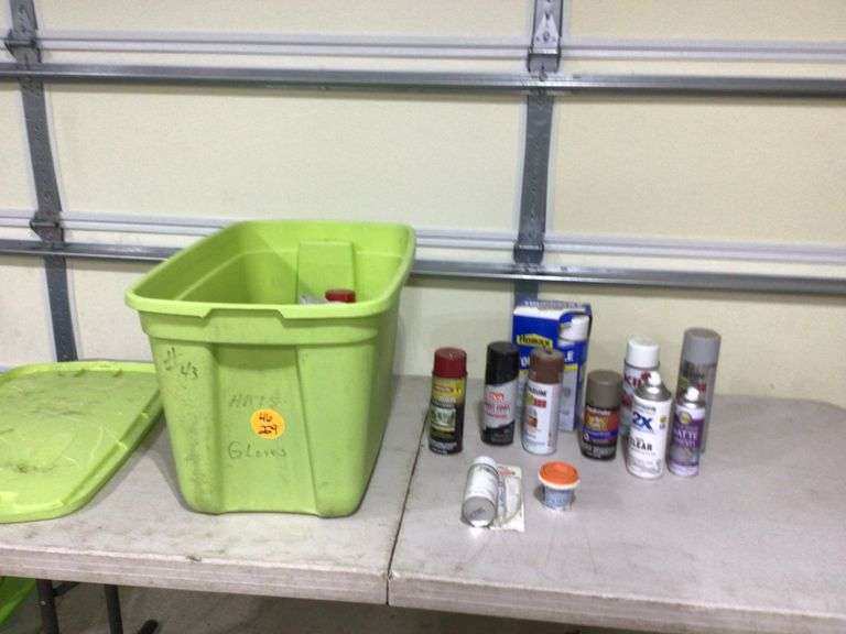 VARIOUS CANS OF SPRAY PAINT IN TOTE W/LID