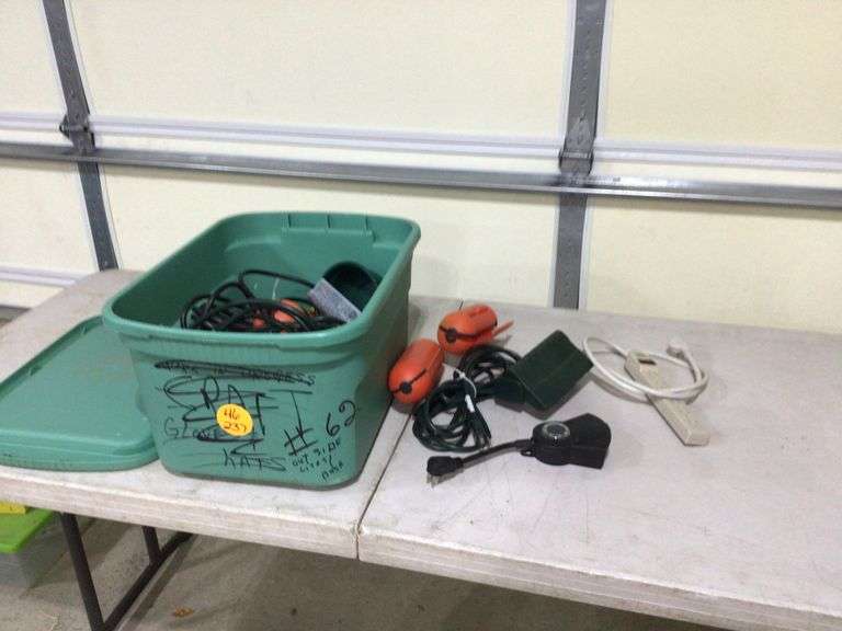 LOT 46-237 - EXTENSIONS CORDS, PLUG-INS, AND MORE ELECTRICAL FOR YARD DECORATIONS IN TOTE W/LID