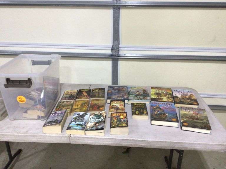 TOM CLANCY AND ERIC FLINT NOVELS IN SMALL TOTE W/LID