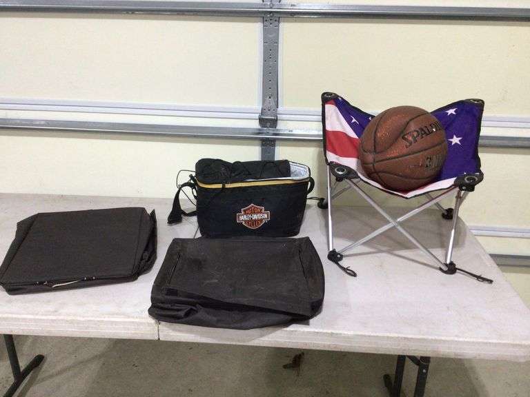 LOT 46-253 - COLLAPSIBLE STORAGE BINS, BASKETBALL, HARLEY-DAVIDSON SOFT COOLER, AND SMALL CHAIR