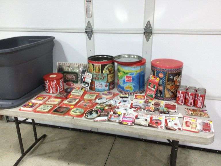 COCA-COLA TINS, GIFT SET, AND MORE IN LARGE TOTE W/LID