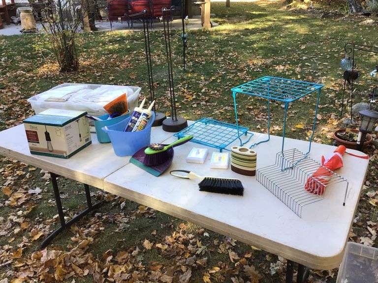 UMBRELLA, RACKS, HAND BROOM AND DUSTPAN, AND MORE MISC HOUSEHOLD ITEMS IN TOTES(ONE WITH LID)