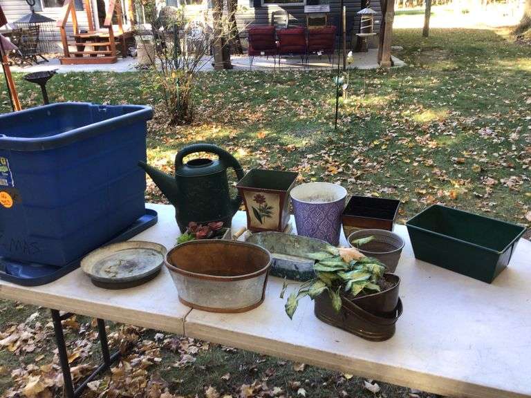 LOT 46-353 - ASSORTED METAL FLOWERPOTS IN TOTE W/LID