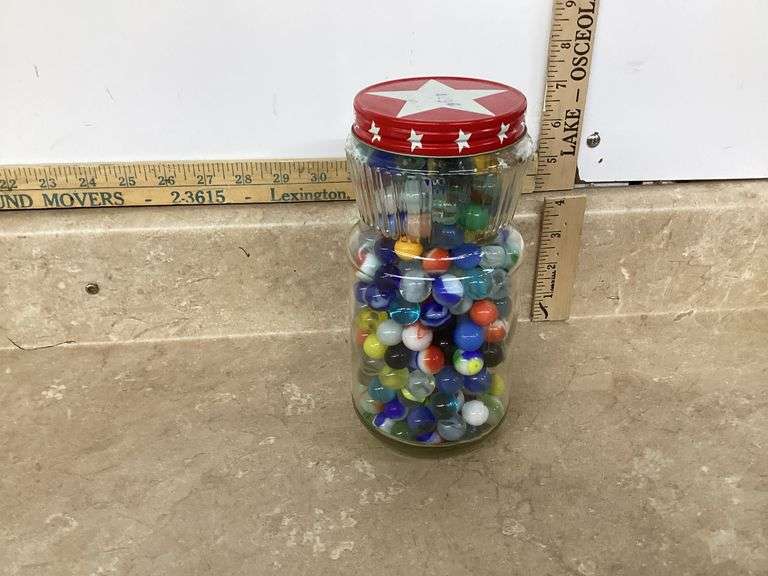 LOT 50-222 - VINTAGE COFFEE JAR FULL OF MARBLES