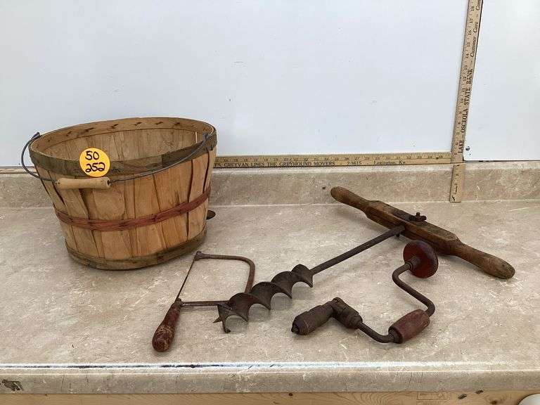 LOT 50-252 - 2 ANTIQUE DRILLS AND SAW IN APPLE BASKET W/HANDLE